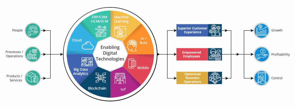 Digital Transformation is the transformation of an organisation’s operations, processes and activities by leveraging a mix of digital technologies to deliver: